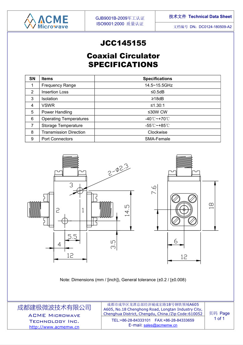 JCC145155(14.5-15.5GHz)_Coaxial CirculatorRelease date:(2018-8-21) Number of clicks:501 |