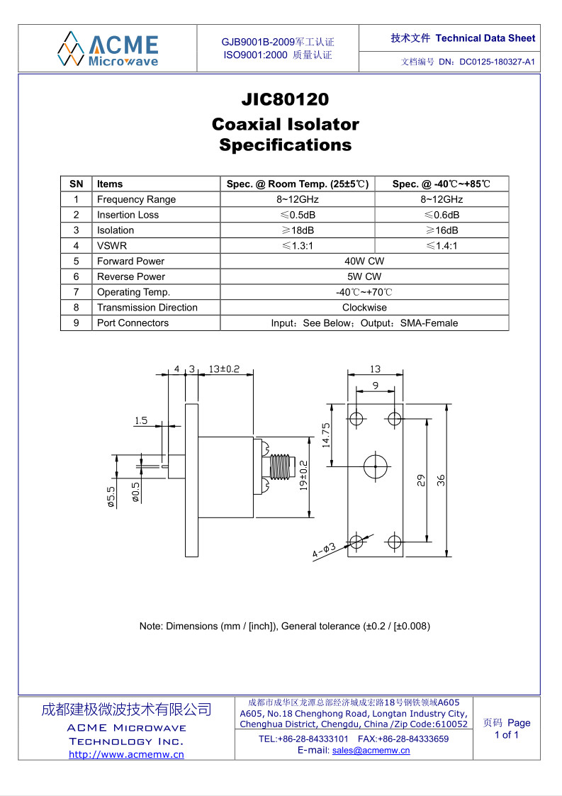 JIC80120(8-12GHz)_Coaxial IsolatorRelease date:(2018-8-21) Number of clicks:590 |