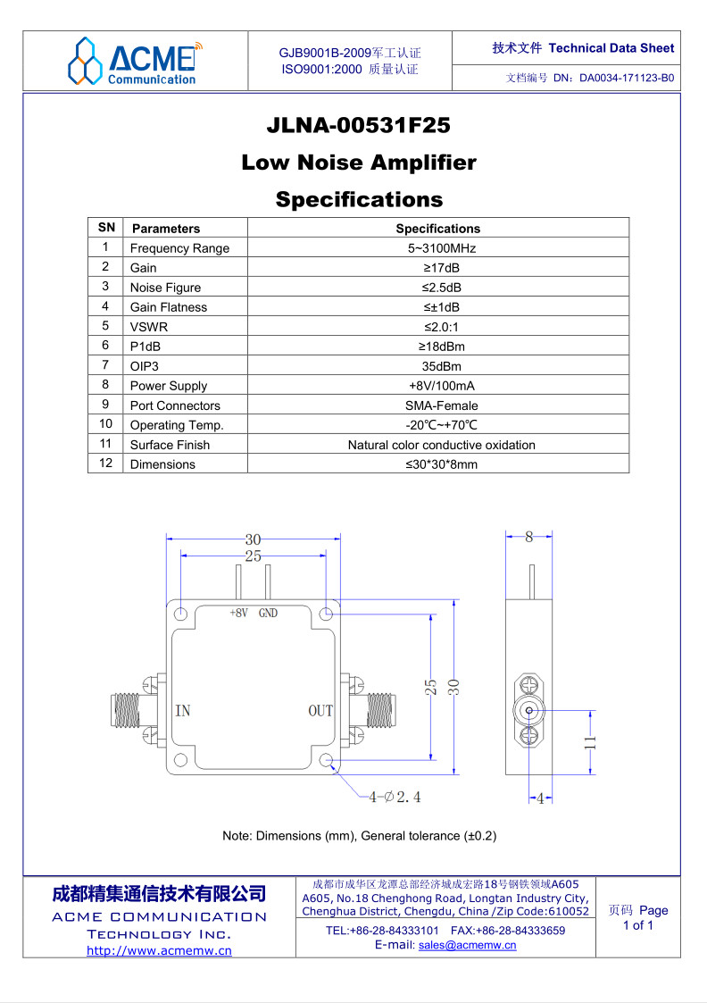 JLNA-00531F25(5-3100MHz)_Low Noise AmplifierRelease date:(2018-8-23) Number of clicks:620 |