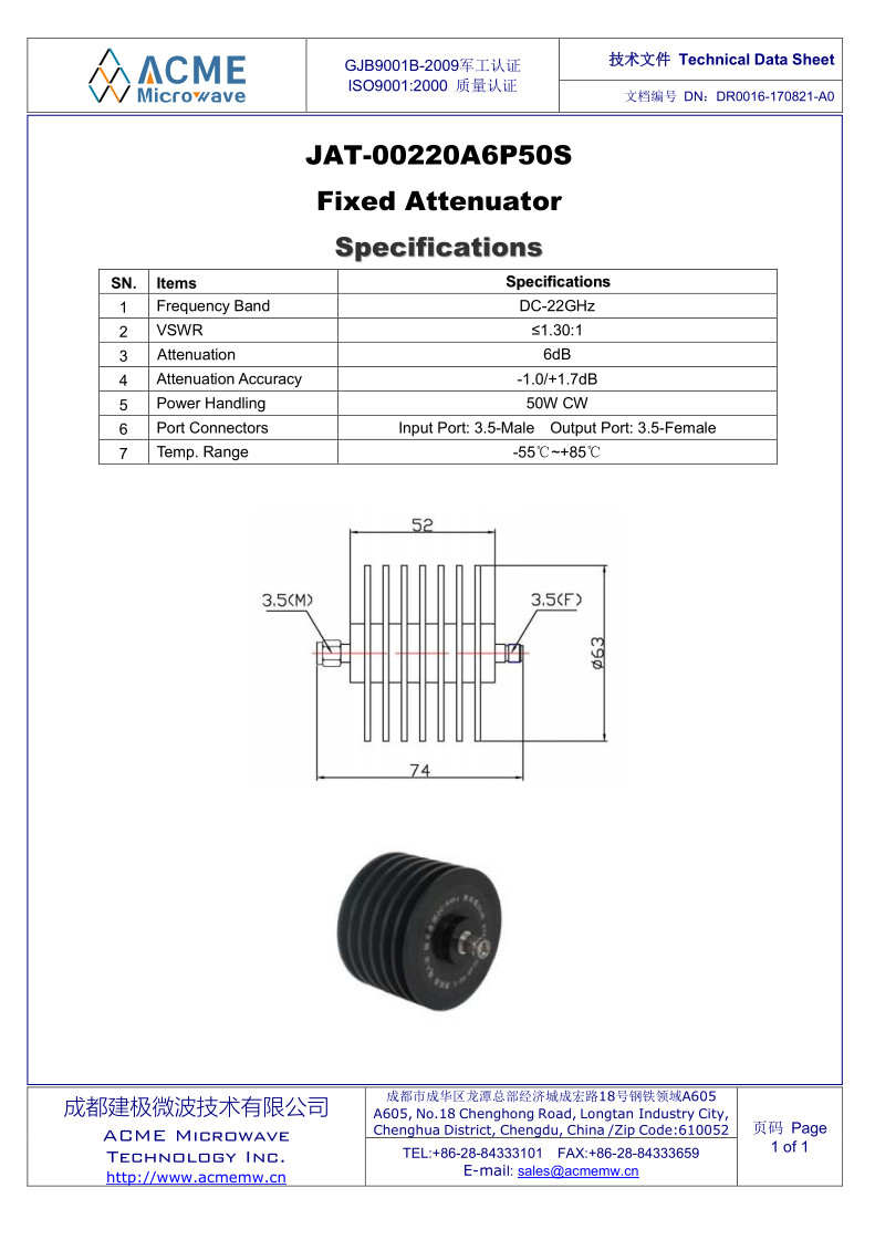 JAT-00220A6P50S_Fixed AttenuatorRelease date:(2018-8-13) Number of clicks:593 |