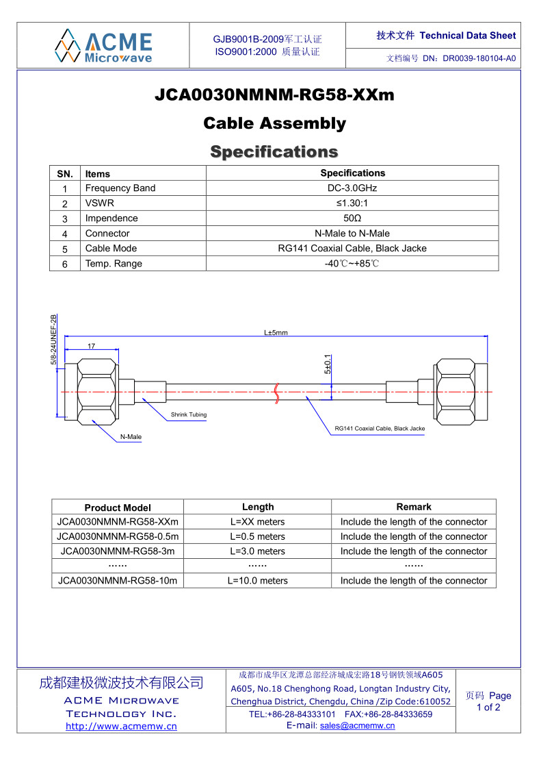JCA0030NMNM-RG58-XXm_Cable AssemblyRelease date:(2018-8-21) Number of clicks:557 |