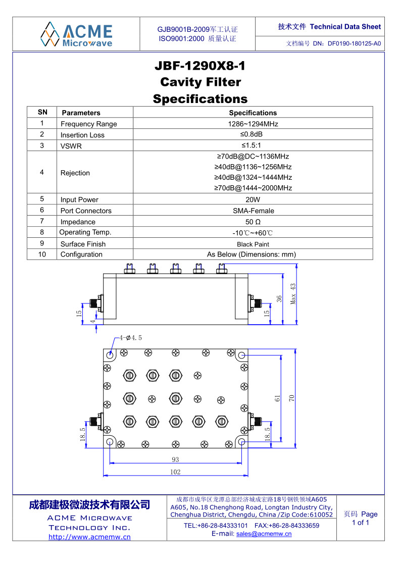 JBF-1290X8-1_Cavity FilterRelease date:(2018-8-21) Number of clicks:547 |