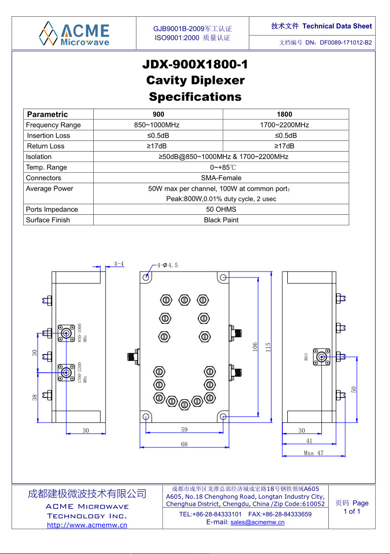 JDX-900X1800-1_Cavity DiplexerRelease date:(2018-8-21) Number of clicks:548 |