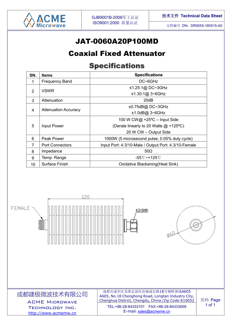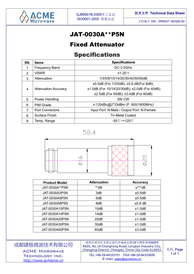 JAT-00100A30P500N_Coaxial Fixed Attenuator